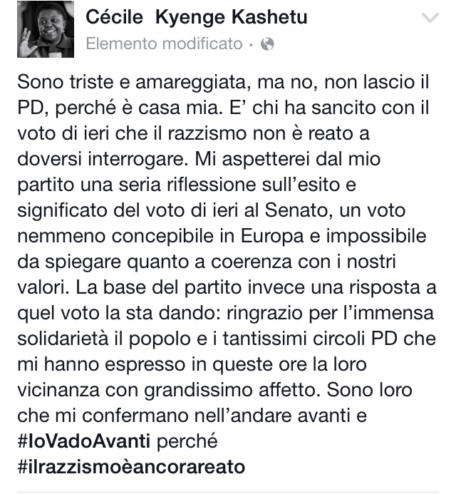 La questione sollevata dall’ex ministro Kyenge è soprattutto di natura politica e culturale, il voto del senato è a mio avviso vergognoso. Il PD sui territori però dimostra una volta di più di essere composto da un’umanita spesso diversa e più sensibile, come testimoniano le stesse parole di Cécile. Anche da Verbania voglio che le arrivi tutta la solidarietà che merita e l’invito ad andare avanti per vincere questa battaglia di civiltà. E a quelli che difendono questa decisione citando l’art.68 della costituzione dico che le parole di un senatore, anche se espresse durante l’esercizio delle sue funzioni, devono portare con se tutto il senso di responsabilità e la dignità di un rappresentante della Repubblica. Il razzismo è e deve essere reato! Tanti sono i parlamentari e i dirigenti Pd che in queste ore si sono espressi contro la decisione del senato e chiedo a tutti loro di voler aprire una discussione seria su quanto è accaduto, a partire dalla direzione nazionale di lunedì prossimo.