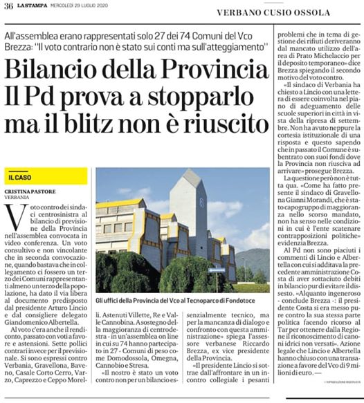 La bassissima partecipazione dei Sindaci all’assemblea che aveva all’ordine del giorno il bilancio di previsione 2020 rappresenta lo scollamento che ormai si sta misurando tra l’Ente Provincia e il territorio. Il Presidente e la maggioranza consiliare si sottraggono al confronto su temi fondamentali per il territorio come l’edilizia scolastica e il futuro del ciclo dei rifiuti nel VCO. Lincio sostiene che in materia di rifiuti la Provincia eserciti solo un ruolo di controllo e per questa ragione non debba aprire una riflessione con i comuni. Un atteggiamento superficiale che rischia di far spendere più soldi ai comuni e fa venire meno quel ruolo di programmazione proprio dell’Ente Provincia. Per queste ragioni il Comune di Verbania, insieme ad altri 6 comuni, ha espresso voto contrario.
