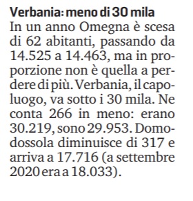 Su La Stampa VCO di oggi troviamo un articolo interessante di Cristina Pastore riguardante il calo demografico della nostra provincia, argomento noto vero, ma che obbliga tutti ad un riflessione che non può essere solamente legata ad un trend nazionale che pure è sotto gli occhi di tutti. La Città di Verbania ha perso in un anno 266 abitati scendendo sotto la quota dei 30.000 abitanti e arrivando a 29.953, credo in questo dato sia da considerare anche l’incidenza della pandemia da Covid-19. In ogni caso questo è un trend che apparentemente non si riesce ad invertire e che impone riflessioni non più rinviabili sulle politiche da attuare nei prossimi anni in ambito di servizi alla persone, servizi tecnologici alle imprese, collegamenti con le aree metropolitane a noi vicine e politiche abitative con particolare riferimento ai giovani e alle famiglie.Io penso che per affrontare tutti questi temi con più efficacia non si possa non prendere in considerazione il tema delle fusioni tra i Comuni, questione che in questo territorio ha visto (pochi) esempi virtuosi ma anche clamorose occasioni mancate. Certo le fusioni da sole non rappresentano la soluzione del problema, dal momento che non basta unire sistemi già fragili per garantire una crescita, ma è pur vero che molte delle sfide sopra citate necessitano, per essere affrontate e risolte, di allargare il perimetro di gioco e aumentare il peso specifico dei singoli attori in campo, quindi delle comunità di riferimento. Su questo tema, ormai più di un anno fa, era emersa una bella e suggestiva proposta dal blog Verbaniasettanta “UNA PROVINCIA PER UNA DOZZINA DI COMUNI” che riporto qui di seguito: